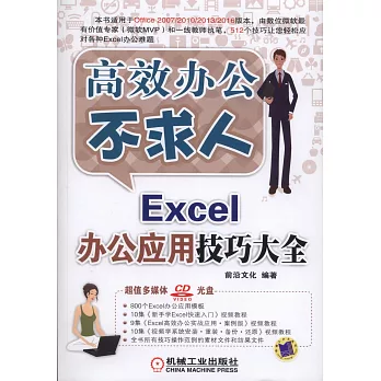 內容簡介: 本書匯集了多位微軟MVP和一線教師的實踐經驗,結合職場工作的應用需求,通過列舉豐富的案例,並以技巧羅列的方式給讀者講解博客來書店了Excel辦公應用技巧與經驗。博客來網路書店全書共分為16章,內容包括:Excel環境優化技巧,Excel工作簿與工作表操作技巧,Excel工作表數據錄入與編輯技巧,Excel工作表行、列和單元格操作技巧,Excel工作表格式設置與美化技巧,Excel公式運算技巧,Excel函數(常用函數、財務函數、數學函數、日期與時間函數、統計函數、查找函數等)應用技巧,Excel條件格式與數據驗證應用技巧,Excel數據的排序與篩選技巧,Excel數據處理與分析技巧,Excel圖表與迷你圖應用技巧,Excel數據透視表與透視圖應用技巧,以及Excel表格安全、共享與打印技巧。
